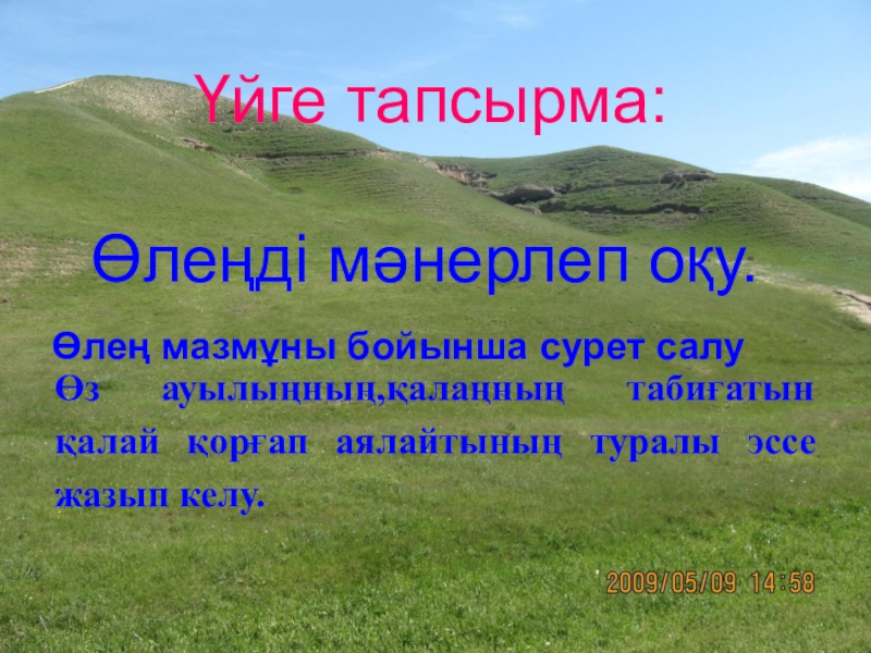 Үйге тапсырма: Өлеңді мәнерлеп оқу.Өлең мазмұны бойынша сурет салу