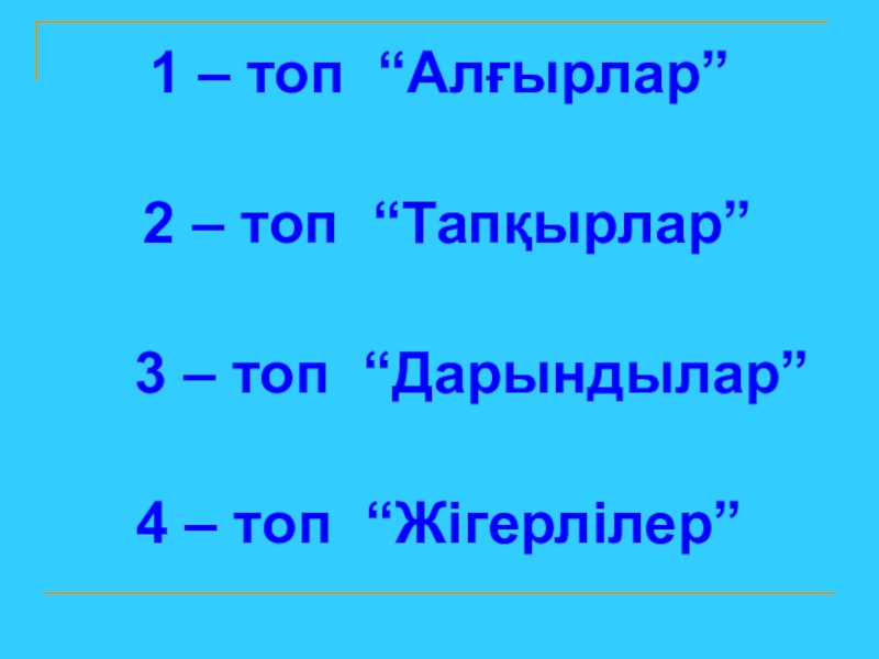 1 – топ “Алғырлар” 2 – топ “Тапқырлар”  3 – топ “Дарындылар”4 – топ “Жігерлілер”