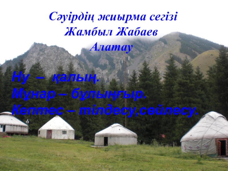 Сәуірдің жиырма сегізі Жамбыл Жабаев Алатау Ну – қалың. Мұнар – бұлыңғыр. Кептес – тілдесу,сөйлесу.