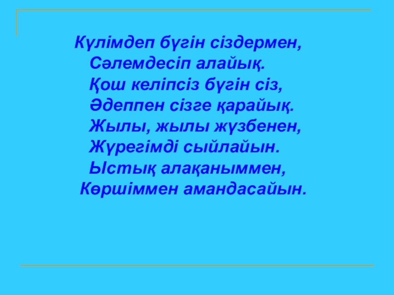 Күлімдеп бүгін сіздермен,       Сәлемдесіп алайық.       Қош келіпсіз бүгін сіз,       Әдеппен сізге қарайық.       Жылы, жылы жүзбенен,       Жүрегімді