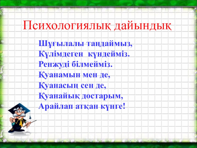 Психологиялық дайындықШұғылалы таңдаймыз, Күлімдеген күндейміз. Ренжуді білмейміз. Қуанамын мен де, Қуанасың сен де, Қуанайық достарым, Арайлап атқан күнге!