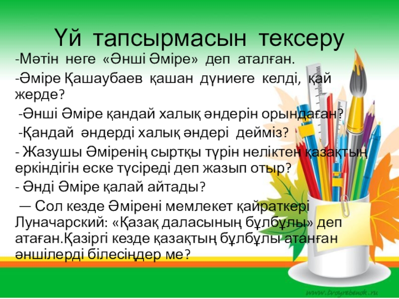 — Сол кезде Әмірені мемлекет қайраткері Луначарский: «Қазақ даласының бұлбұлы» деп атаған.Қазіргі кезде қазақтың бұлбұлы атанған әншілерді білесіңдер ме?