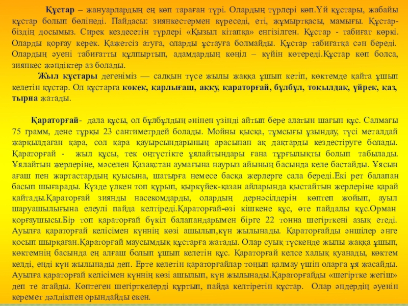 көп.Үй құстары, жабайы құстар болып бөлінеді. Пайдасы: зиянкестермен күреседі, еті, жұмыртқасы, мамығы. Құстар- біздің досымыз. Сирек кездесетін түрлері «Қызыл кітапқа» енгізілген. Құстар - табиғат көркі. Оларды қорғау керек. Қажетсіз атуға, оларды ұстауға болмайды. Құстар табиғатқа сән береді. Олардың әуені табиғатты құлпыртып, адамдардың көңіл – күйін көтереді.Құстар көп болса, зиянкес жәндіктер аз болады.
