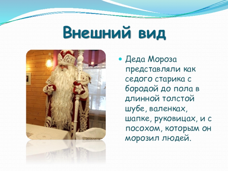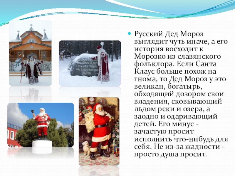 Слайд 15Русский Дед Мороз выглядит чуть иначе, а его история восходит к