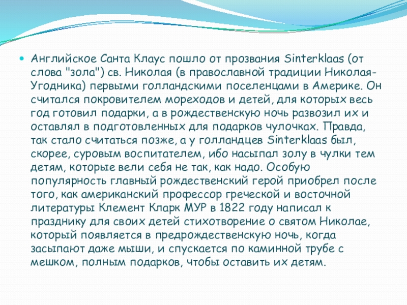 Николая (в православной традиции Николая-Угодника) первыми голландскими поселенцами в Америке. Он считался покровителем мореходов и детей, для которых весь год готовил подарки, а в рождественскую ночь развозил их и оставлял в подготовленных для подарков чулочках. Правда, так стало считаться позже, а у голландцев Sinterklaas был, скорее, суровым воспитателем, ибо насыпал золу в чулки тем детям, которые вели себя не так, как надо. Особую популярность главный рождественский герой приобрел после того, как американский профессор греческой и восточной литературы Клемент Кларк МУР в 1822 году написал к празднику для своих детей стихотворение о святом Николае, который появляется в предрождественскую ночь, когда засыпают даже мыши, и спускается по каминной трубе с мешком, полным подарков, чтобы оставить их детям.