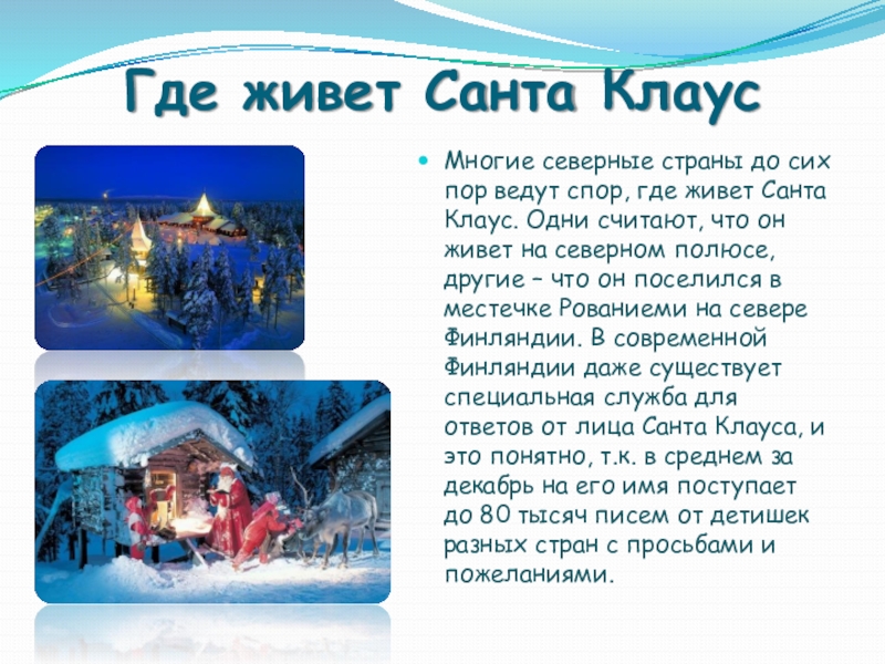 где живет Санта Клаус. Одни считают, что он живет на северном полюсе, другие – что он поселился в местечке Рованиеми на севере Финляндии. В современной Финляндии даже существует специальная служба для ответов от лица Санта Клауса, и это понятно, т.к. в среднем за декабрь на его имя поступает до 80 тысяч писем от детишек разных стран с просьбами и пожеланиями.