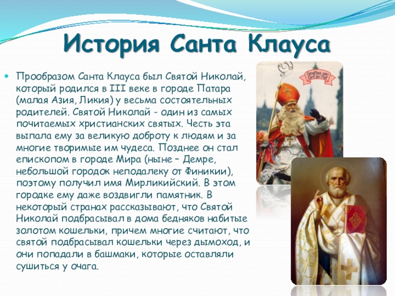 III веке в городе Патара (малая Азия, Ликия) у весьма состоятельных родителей. Святой Николай - один из самых почитаемых христианских святых. Честь эта выпала ему за великую доброту к людям и за многие творимые им чудеса. Позднее он стал епископом в городе Мира (ныне – Демре, небольшой городок неподалеку от Финикии), поэтому получил имя Мирликийский. В этом городке ему даже воздвигли памятник. В некоторый странах рассказывают, что Святой Николай подбрасывал в дома бедняков набитые золотом кошельки, причем многие считают, что святой подбрасывал кошельки через дымоход, и они попадали в башмаки, которые оставляли сушиться у очага.