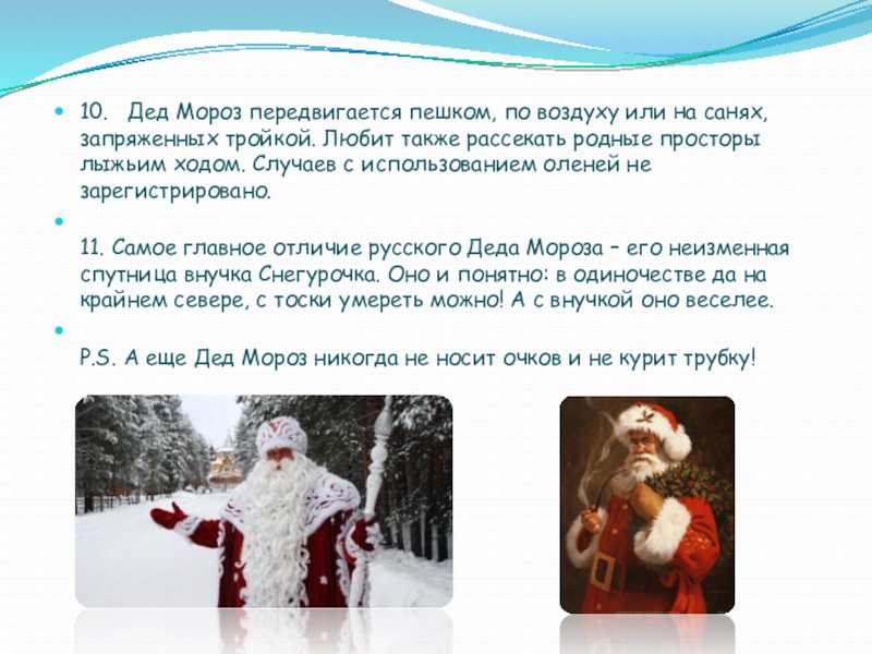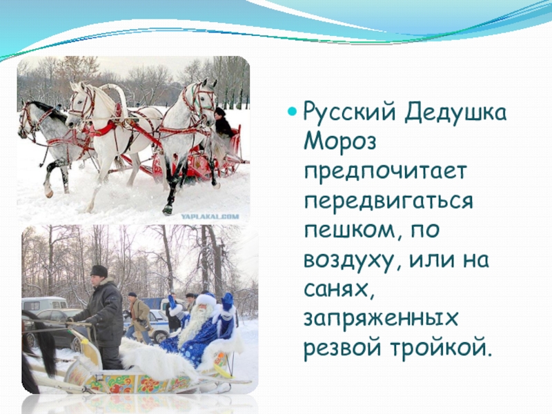 Слайд 8Русский Дедушка Мороз предпочитает передвигаться пешком, по воздуху, или на санях,