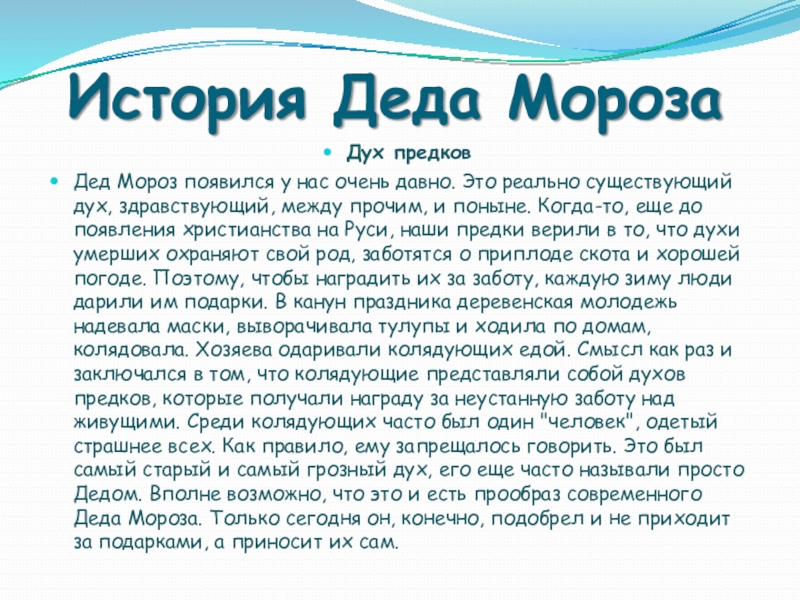 реально существующий дух, здравствующий, между прочим, и поныне. Когда-то, еще до появления христианства на Руси, наши предки верили в то, что духи умерших охраняют свой род, заботятся о приплоде скота и хорошей погоде. Поэтому, чтобы наградить их за заботу, каждую зиму люди дарили им подарки. В канун праздника деревенская молодежь надевала маски, выворачивала тулупы и ходила по домам, колядовала. Хозяева одаривали колядующих едой. Смысл как раз и заключался в том, что колядующие представляли собой духов предков, которые получали награду за неустанную заботу над живущими. Среди колядующих часто был один "человек", одетый страшнее всех. Как правило, ему запрещалось говорить. Это был самый старый и самый грозный дух, его еще часто называли просто Дедом. Вполне возможно, что это и есть прообраз современного Деда Мороза. Только сегодня он, конечно, подобрел и не приходит за подарками, а приносит их сам.