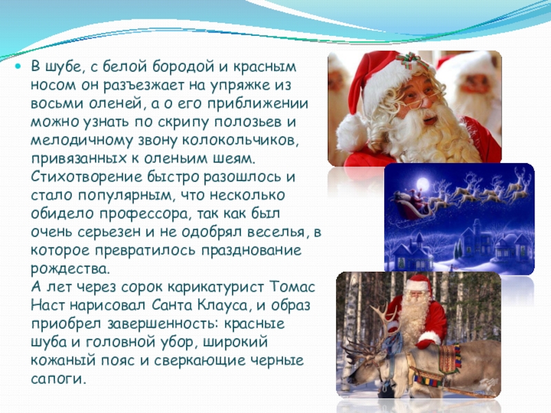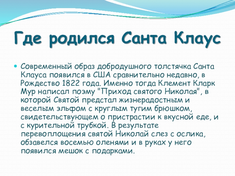 США сравнительно недавно, в Рождество 1822 года. Именно тогда Клемент Кларк Мур написал поэму "Приход святого Николая", в которой Святой предстал жизнерадостным и веселым эльфом с круглым тугим брюшком, свидетельствующем о пристрастии к вкусной еде, и с курительной трубкой. В результате перевоплощения святой Николай слез с ослика, обзавелся восемью оленями и в руках у него появился мешок с подарками.