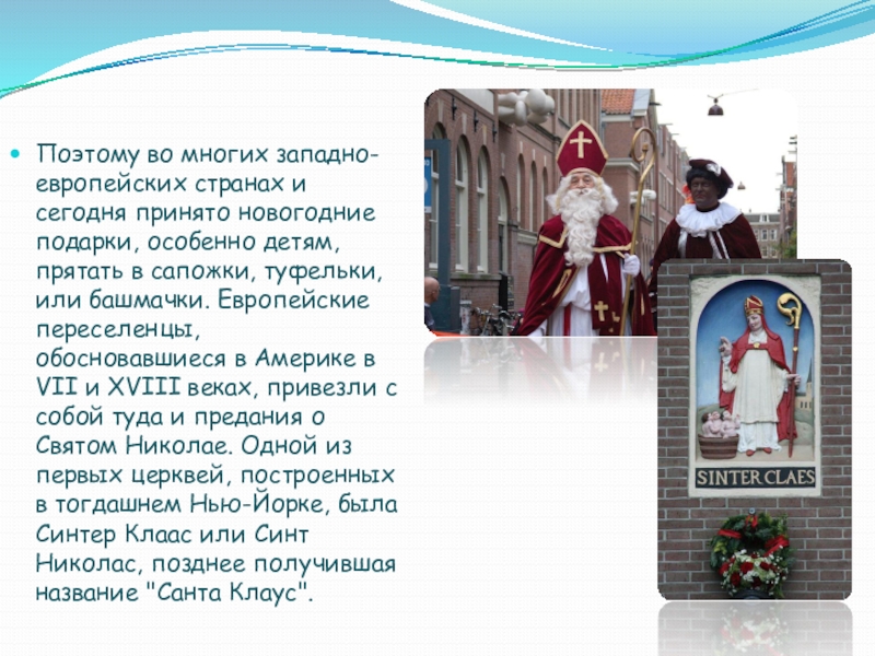 детям, прятать в сапожки, туфельки, или башмачки. Европейские переселенцы, обосновавшиеся в Америке в VII и XVIII веках, привезли c собой туда и предания о Святом Николае. Одной из первых церквей, построенных в тогдашнем Нью-Йорке, была Синтер Клаас или Синт Николас, позднее получившая название "Санта Клаус".