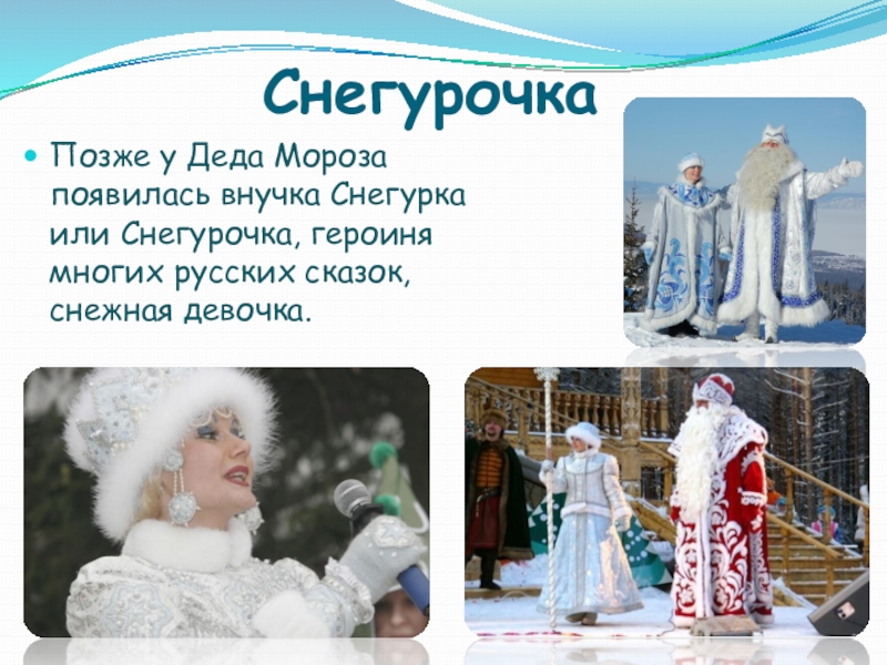 Позже у Деда Мороза появилась внучка Снегурка или Снегурочка, героиня многих
