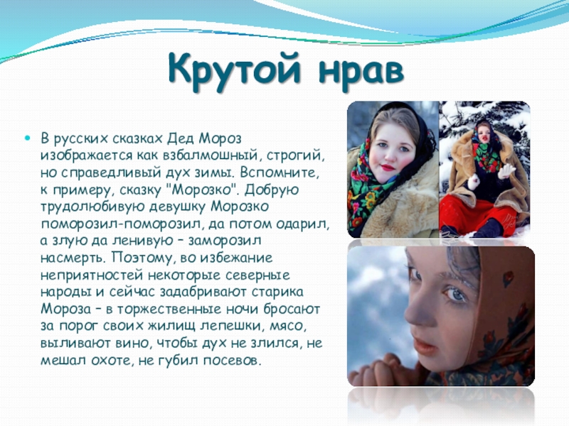 справедливый дух зимы. Вспомните, к примеру, сказку "Морозко". Добрую трудолюбивую девушку Морозко поморозил-поморозил, да потом одарил, а злую да ленивую – заморозил насмерть. Поэтому, во избежание неприятностей некоторые северные народы и сейчас задабривают старика Мороза – в торжественные ночи бросают за порог своих жилищ лепешки, мясо, выливают вино, чтобы дух не злился, не мешал охоте, не губил посевов.