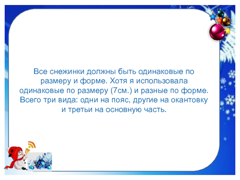 Слайд 6Все снежинки должны быть одинаковые по размеру и форме. Хотя я