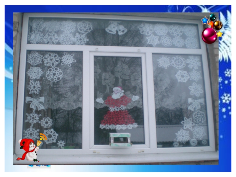 Слайд 10Чтобы снежинки хорошо держались на окне, слегка смазываем их клеем –