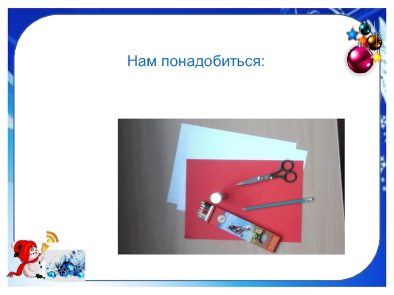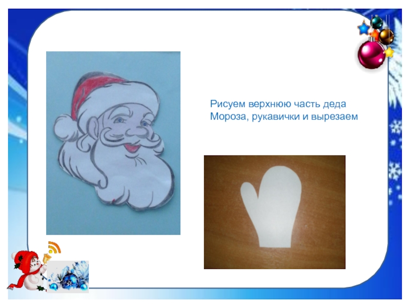 Слайд 7Рисуем верхнюю часть деда Мороза, рукавички и вырезаем