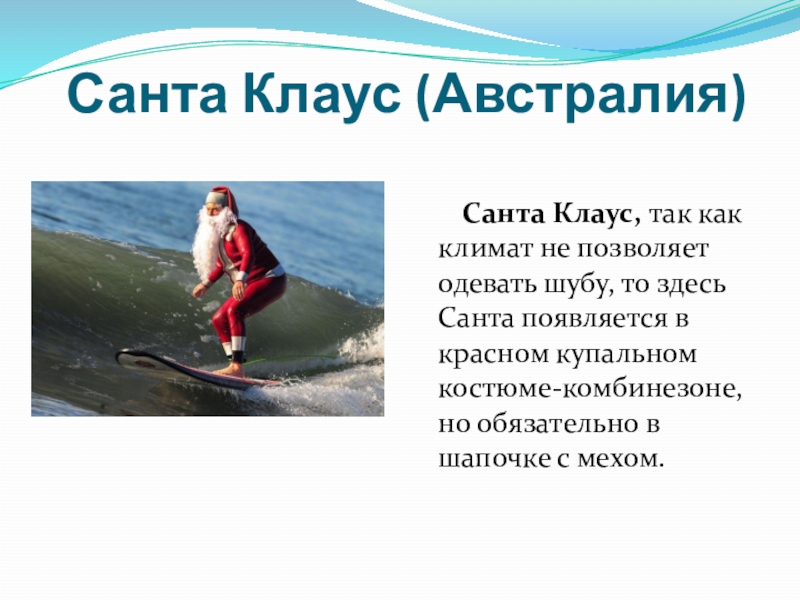климат не позволяет одевать шубу, то здесь Санта появляется в красном купальном костюме-комбинезоне, но обязательно в шапочке с мехом.
