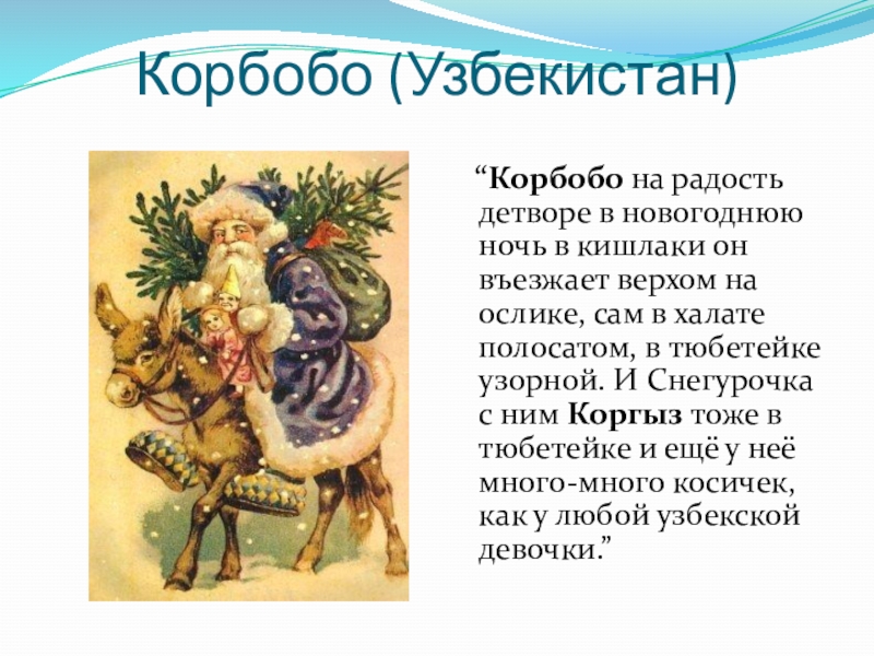 кишлаки он въезжает верхом на ослике, сам в халате полосатом, в тюбетейке узорной. И Снегурочка с ним Коргыз тоже в тюбетейке и ещё у неё много-много косичек, как у любой узбекской девочки.”