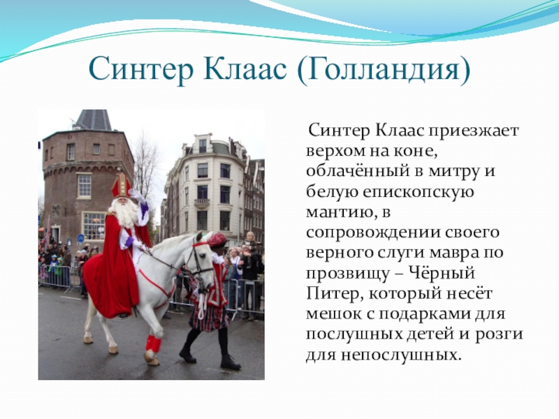 в митру и белую епископскую мантию, в сопровождении своего верного слуги мавра по прозвищу – Чёрный Питер, который несёт мешок с подарками для послушных детей и розги для непослушных.