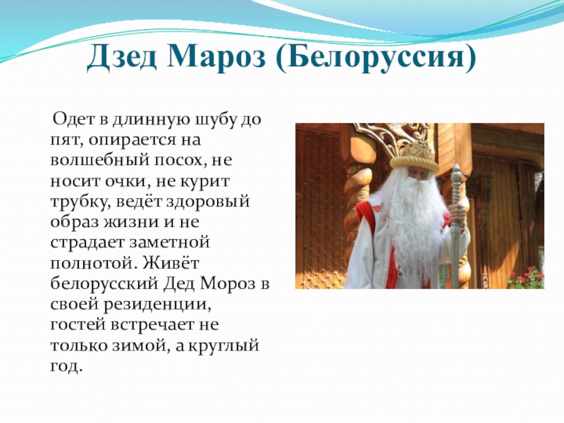 опирается на волшебный посох, не носит очки, не курит трубку, ведёт здоровый образ жизни и не страдает заметной полнотой. Живёт белорусский Дед Мороз в своей резиденции, гостей встречает не только зимой, а круглый год.