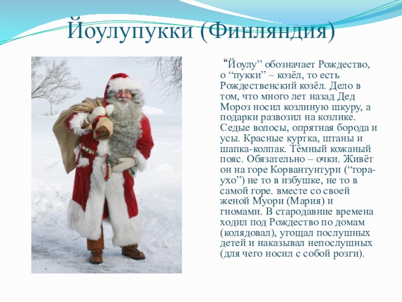 то есть Рождественский козёл. Дело в том, что много лет назад Дед Мороз носил козлиную шкуру, а подарки развозил на козлике. Седые волосы, опрятная борода и усы. Красные куртка, штаны и шапка-колпак. Тёмный кожаный пояс. Обязательно – очки. Живёт он на горе Корвантунтури (“гора-ухо”) не то в избушке, не то в самой горе. вместе со своей женой Муори (Мария) и гномами. В стародавние времена ходил под Рождество по домам (колядовал), угощал послушных детей и наказывал непослушных (для чего носил с собой розги).