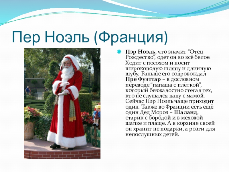 всё белое. Ходит с посохом и носит широкополую шляпу и длинную шубу. Раньше его сопровождал Пре Фуэттар – в дословном переводе “папаша с плёткой”, который безжалостно стегал тех, кто не слушался папу с мамой. Сейчас Пэр Ноэль чаще приходит один. Также во Франции есть ещё один Дед Мороз – Шаланд, старик с бородой и в меховой шапке и плаще. А в корзине своей он хранит не подарки, а розги для непослушных детей.