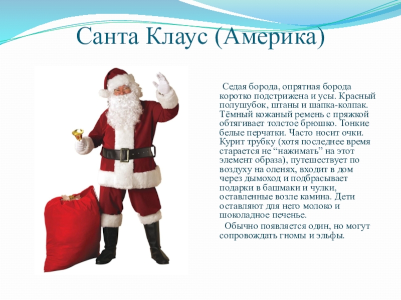 и усы. Красный полушубок, штаны и шапка-колпак. Тёмный кожаный ремень с пряжкой обтягивает толстое брюшко. Тонкие белые перчатки. Часто носит очки. Курит трубку (хотя последнее время старается не “нажимать” на этот элемент образа), путешествует по воздуху на оленях, входит в дом через дымоход и подбрасывает подарки в башмаки и чулки, оставленные возле камина. Дети оставляют для него молоко и шоколадное печенье.