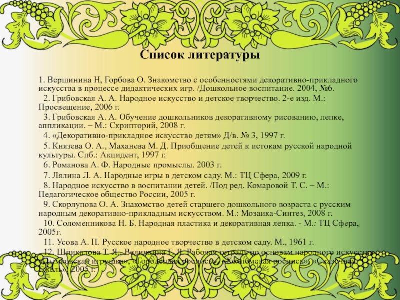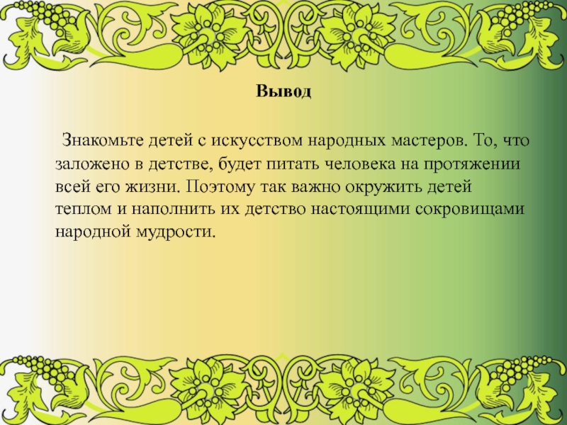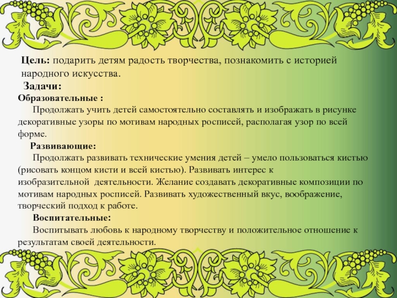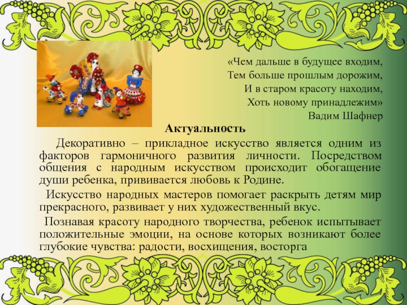 Декоративно – прикладное искусство является одним из факторов гармоничного развития личности. Посредством общения с народным искусством происходит обогащение души ребенка, прививается любовь к Родине.
