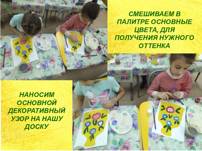 СМЕШИВАЕМ В ПАЛИТРЕ ОСНОВНЫЕ ЦВЕТА, ДЛЯ ПОЛУЧЕНИЯ НУЖНОГО ОТТЕНКАНАНОСИМ ОСНОВНОЙ ДЕКОРАТИВНЫЙ УЗОР НА НАШУ ДОСКУ