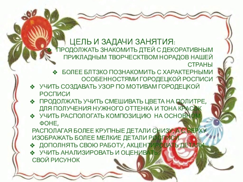 ЦЕЛЬ И ЗАДАЧИ ЗАНЯТИЯ:ПРОДОЛЖАТЬ ЗНАКОМИТЬ ДТЕЙ С ДЕКОРАТИВНЫМ ПРИКЛАДНЫМ ТВОРЧЕСКТВОМ НОРАДОВ НАШЕЙ СТРАНЫБОЛЕЕ БЛТЗКО ПОЗНАКОМИТЬ С ХАРАКТЕРНЫМИ ОСОБЕННОСТЯМИ ГОРОДЕЦКОЙ РОСПИСИУЧИТЬ СОЗДАВАТЬ УЗОР ПО МОТИВАМ ГОРОДЕЦКОЙ РОСПИСИПРОДОЛЖАТЬ УЧИТЬ СМЕШИВАТЬ ЦВЕТА НА ПОЛИТРЕ, ДЛЯ ПОЛУЧЕНИЯ НУЖНОГО ОТТЕНКА И