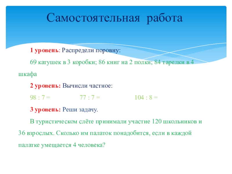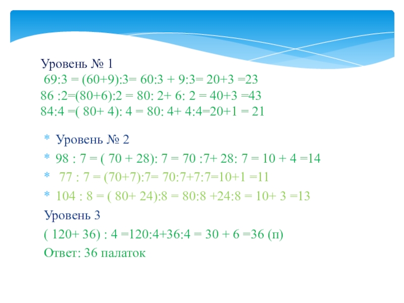 104 : 8 = ( 80+ 24):8 = 80:8 +24:8 = 10+ 3 =13