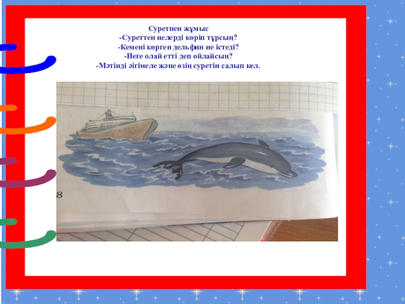 Суретпен жұмыс-Суреттен нелерді көріп тұрсың?-Кемені көрген дельфин не істеді?-Неге олай етті деп ойлайсың?-Мәтінді әігімеле және өзің суретін