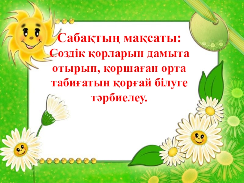 Сабақтың мақсаты:Сөздік қорларын дамыта отырып, қоршаған орта табиғатын қорғай білуге тәрбиелеу.