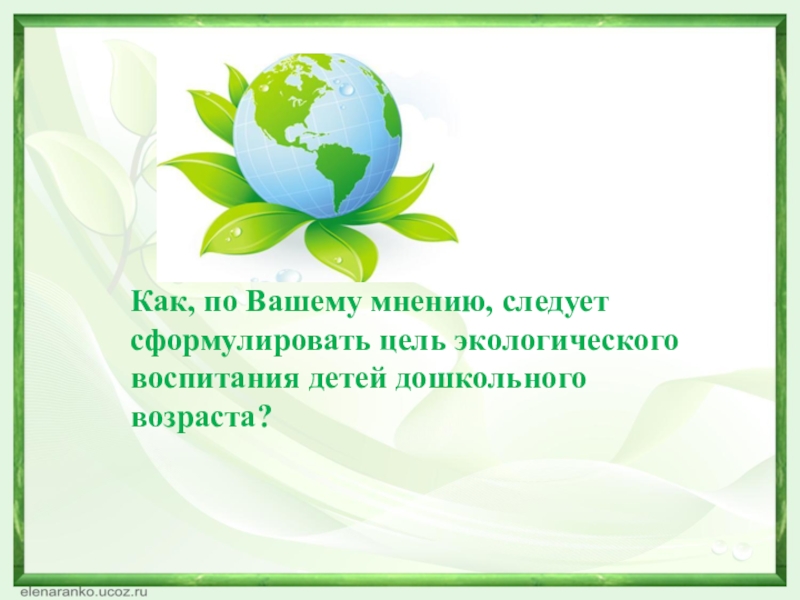 Слайд 12Как, по Вашему мнению, следует сформулировать цель экологического воспитания детей дошкольного