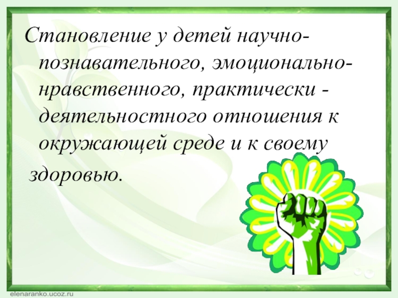 Слайд 13Становление у детей научно-познавательного, эмоционально-нравственного, практически - деятельностного отношения к окружающей