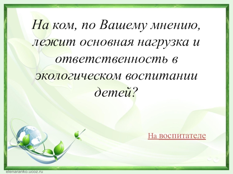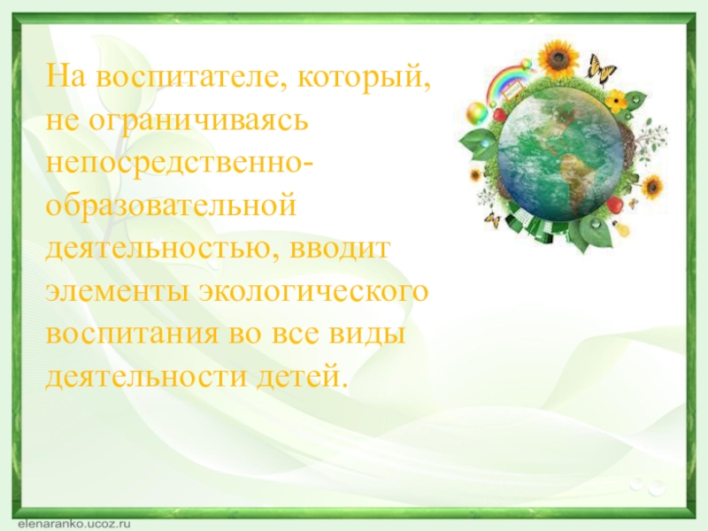 Слайд 15На воспитателе, который, не ограничиваясь непосредственно-образовательной деятельностью, вводит элементы экологического воспитания