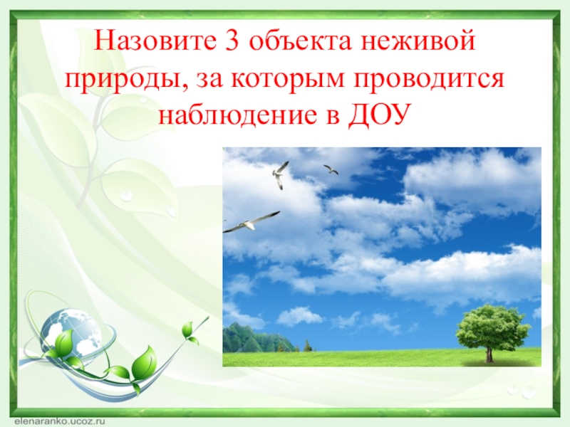 Слайд 19Назовите 3 объекта неживой природы, за которым проводится наблюдение в ДОУ