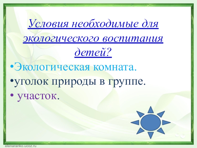 Слайд 16Условия необходимые для экологического воспитания детей?