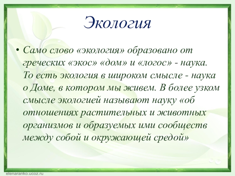 Само слово «экология» образовано от греческих «экос» «дом» и «логос»
