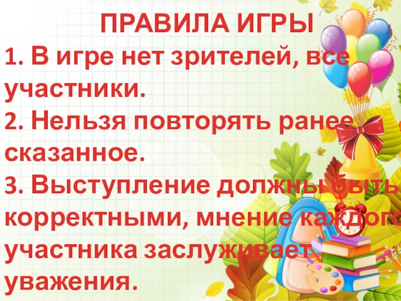 3. Выступление должны быть корректными, мнение каждого участника заслуживает уважения.