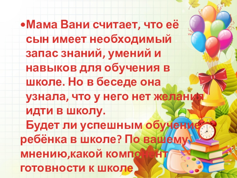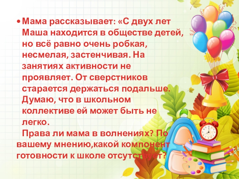 Права ли мама в волнениях? По вашему мнению,какой компонент готовности к школе отсутствует?