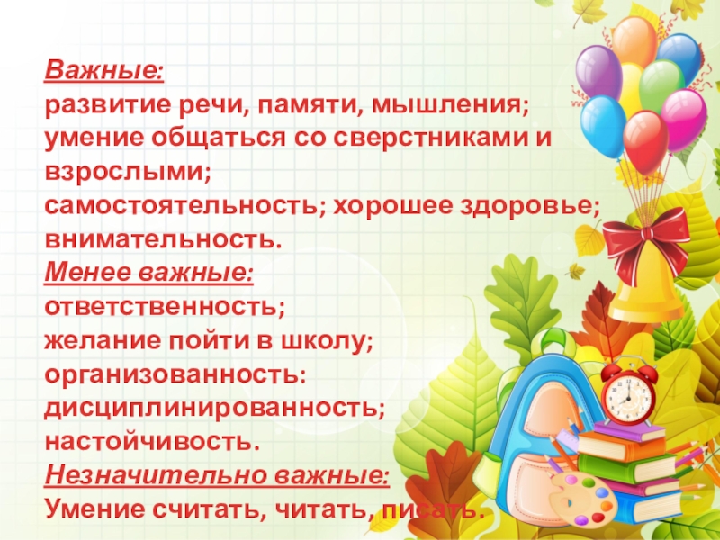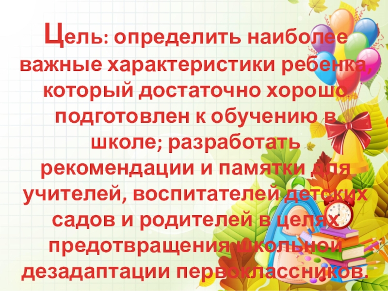 Слайд 2Цель: определить наиболее важные характеристики ребенка, который достаточно хорошо подготовлен к