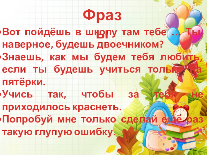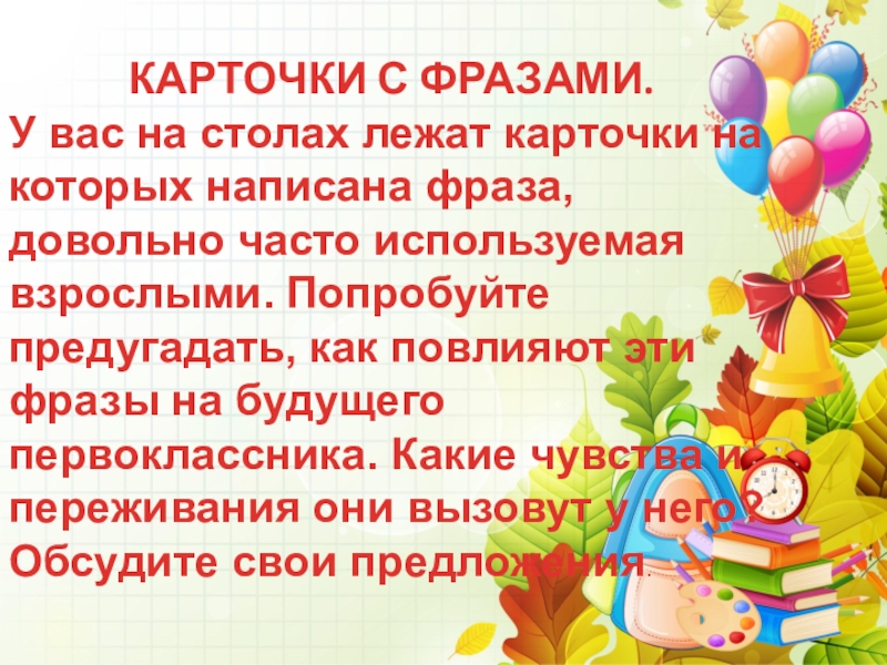 столах лежат карточки на которых написана фраза, довольно часто используемая взрослыми. Попробуйте предугадать, как повлияют эти фразы на будущего первоклассника. Какие чувства и переживания они вызовут у него? Обсудите свои предложения.