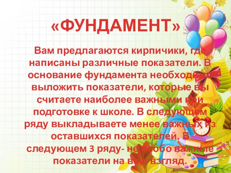 необходимо выложить показатели, которые вы считаете наиболее важными при подготовке к школе. В следующем ряду выкладываете менее важных из оставшихся показателей. В следующем 3 ряду- не особо важные показатели на ваш взгляд.