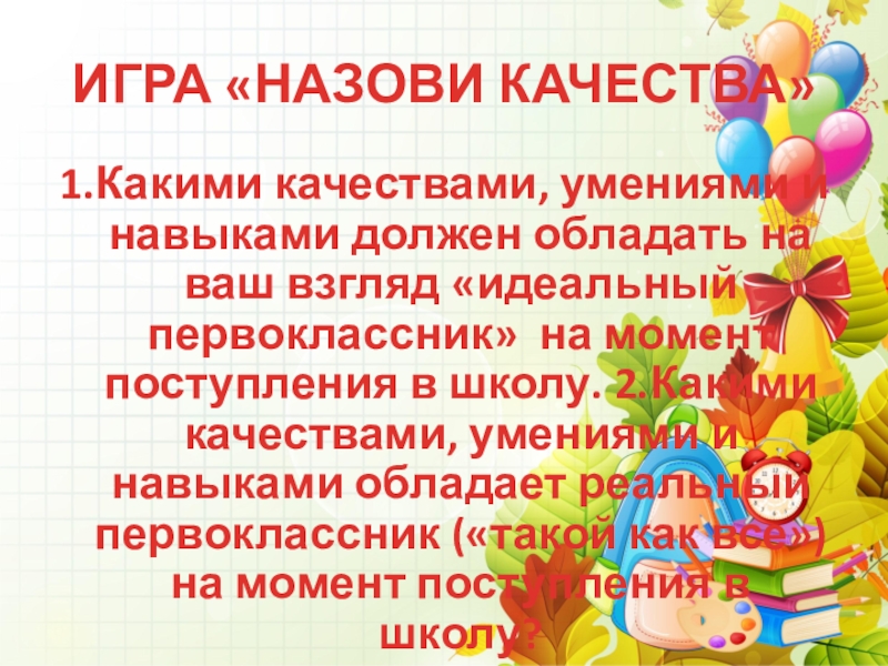 взгляд «идеальный первоклассник» на момент поступления в школу. 2.Какими качествами, умениями и навыками обладает реальный первоклассник («такой как все») на момент поступления в школу?
