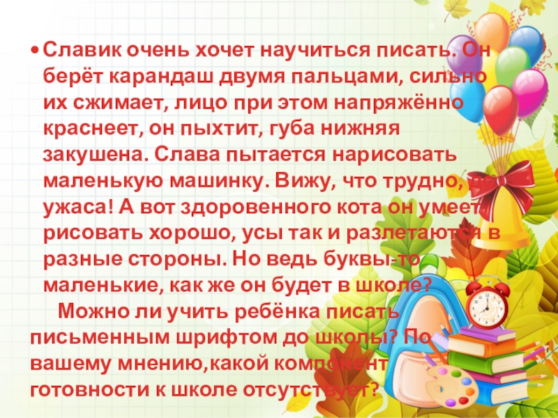 Можно ли учить ребёнка писать письменным шрифтом до школы? По вашему мнению,какой компонент готовности к школе отсутствует?