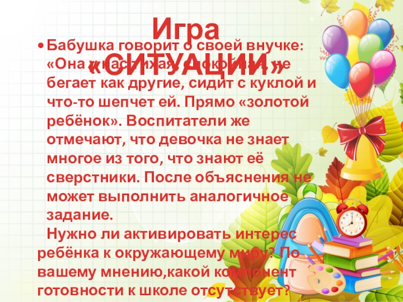 Нужно ли активировать интерес ребёнка к окружающему миру? По вашему мнению,какой компонент готовности к школе отсутствует?