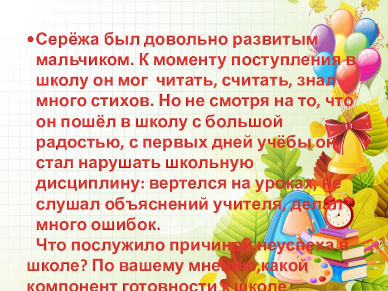 Слайд 13Серёжа был довольно развитым мальчиком. К моменту поступления в школу он