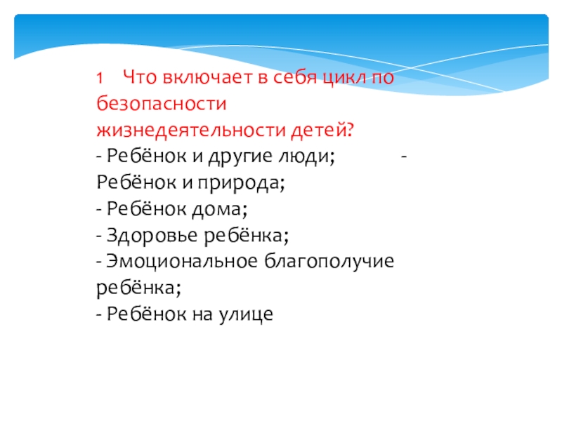 1  Что включает в себя цикл по безопасности жизнедеятельности детей? - Ребёнок и другие люди;