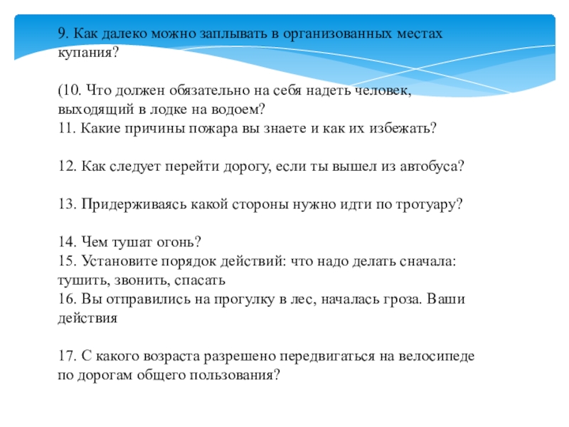 9. Как далеко можно заплывать в организованных местах купания? (10. Что должен обязательно на себя надеть человек,